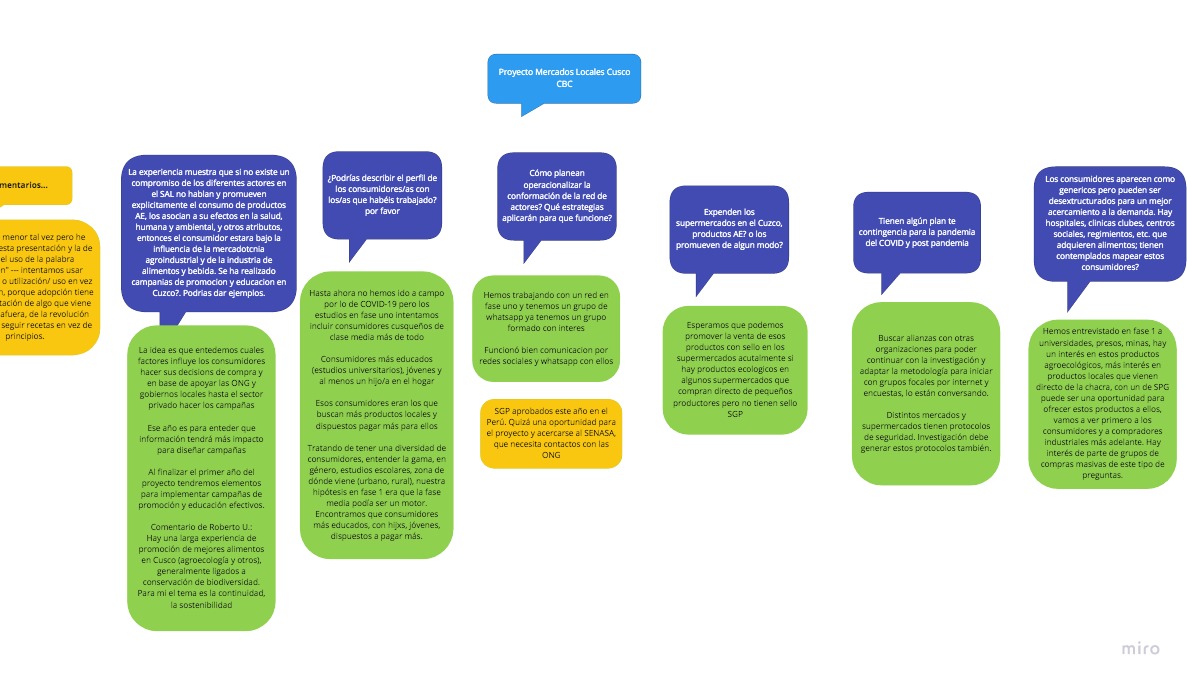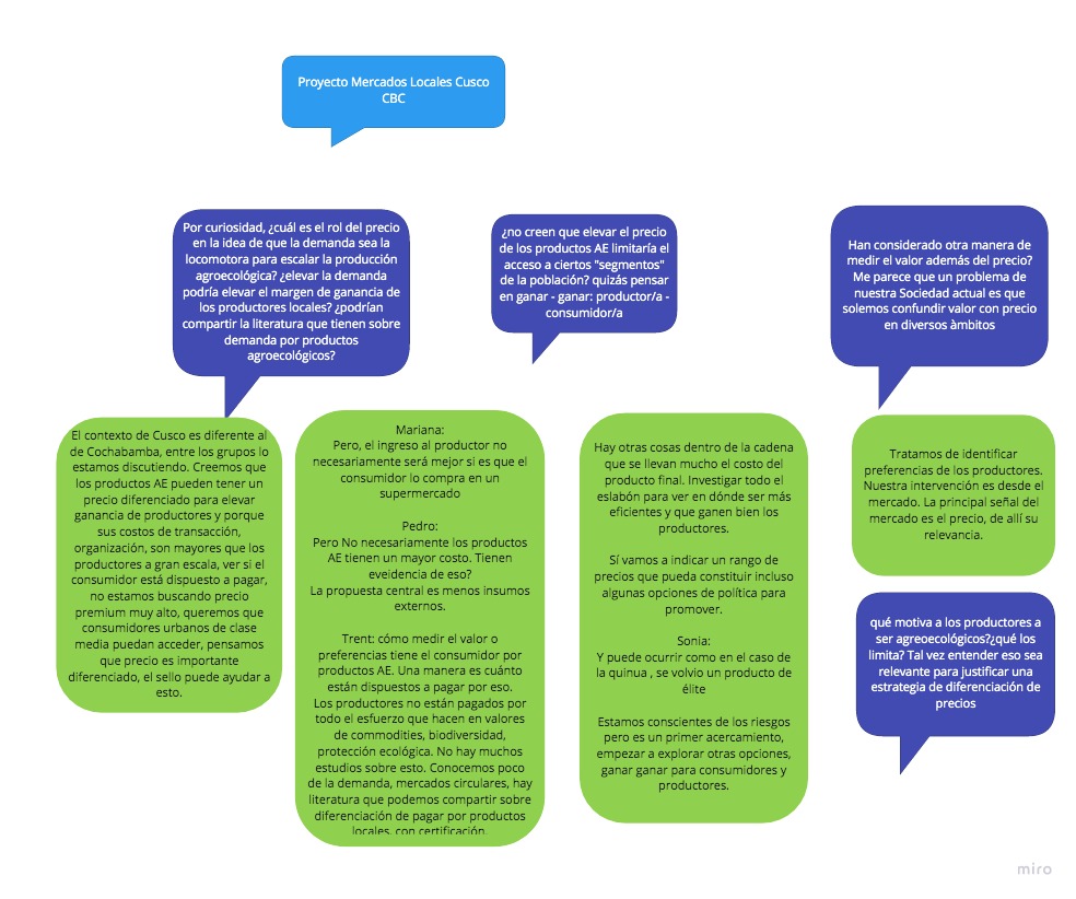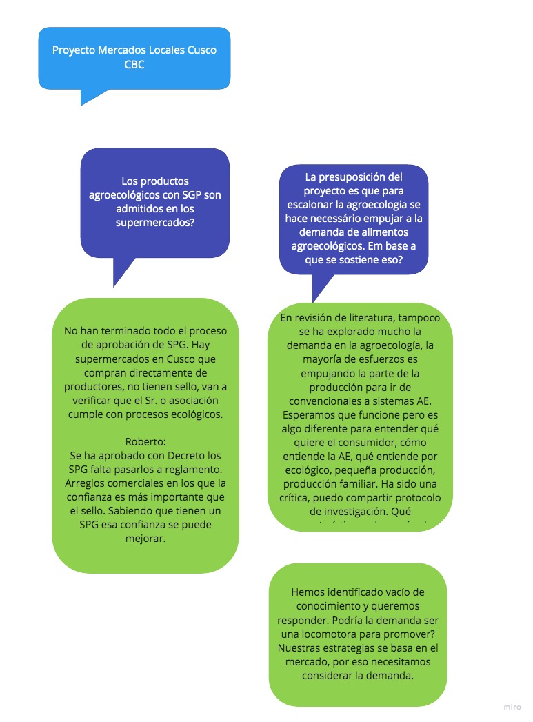 Año 1 (2020). Entender el consumo de productos agroecológicos en Cusco: Las intervenciones agroecológicas en Cusco se han enfocado en el lado de la oferta. La conceptualización y el entendimiento de lo que es la agroecología y lo que es un producto agroecológico son conceptos difíciles de entender y transmitir hacia los consumidores. Se busca entender las preferencias, valoraciones y disponibilidad a pagar por principios y atributos de los alimentos producidos bajo principios agroecológicos por parte de los consumidores cusqueños en mercados locales, supermercados y ferias de productores.