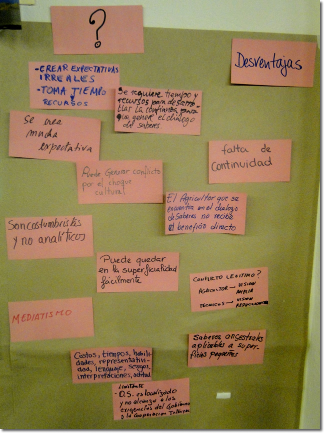 A través de un ejercicio de Pro y Contra, los participantes identificaron algunas ventajas y desventajas del diálogo de saberes.