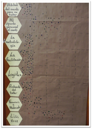 · La sistematización es de muy alta calidad. Esta es una buena herramienta para que el equipo regional se refiera a los contenidos del evento. Quizás ustedes no están interesados en referirse a lo sucedido. Al parecer, ustedes desean una versión local de la información (USB, FTP para descargar, redes de distribución libres de virus), es decir, otras formas para que el costo ambiental no sea tan alto. (C. Barahona, Equipo Regional).