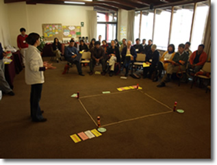 Los Miembros del Comité de Informe (Katherine, María, Enrique) organizaron una dinámica, para invitar a los participantes a complementar la síntesis temática y metodológica preparada por el Comité. La dinámica consistió en que contribuir con una palabra a uno de los cuatro pilares que, de acuerdo al Comité, deberían constituir una sólida base para la comunidad de práctica que se está consolidando. Estos cuatro pilares son: metodologías participativas, concertación, investigación de calidad, resultados de impacto e investigación de calidad.