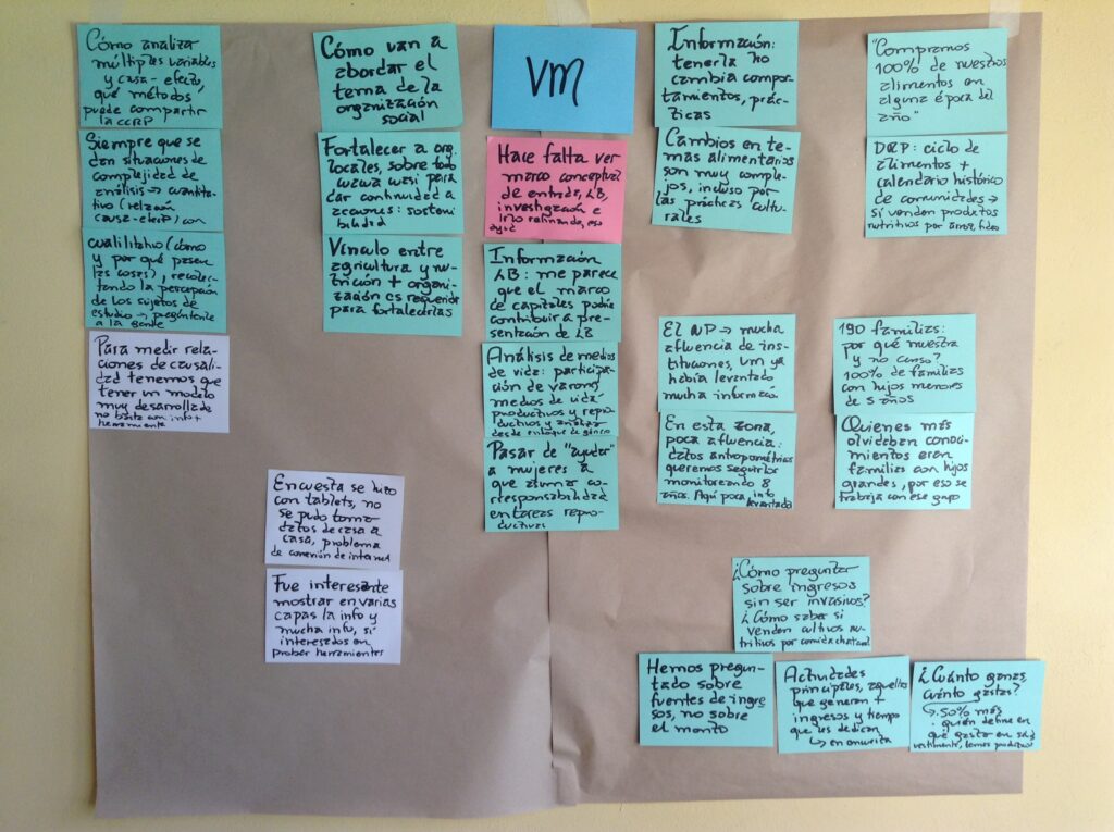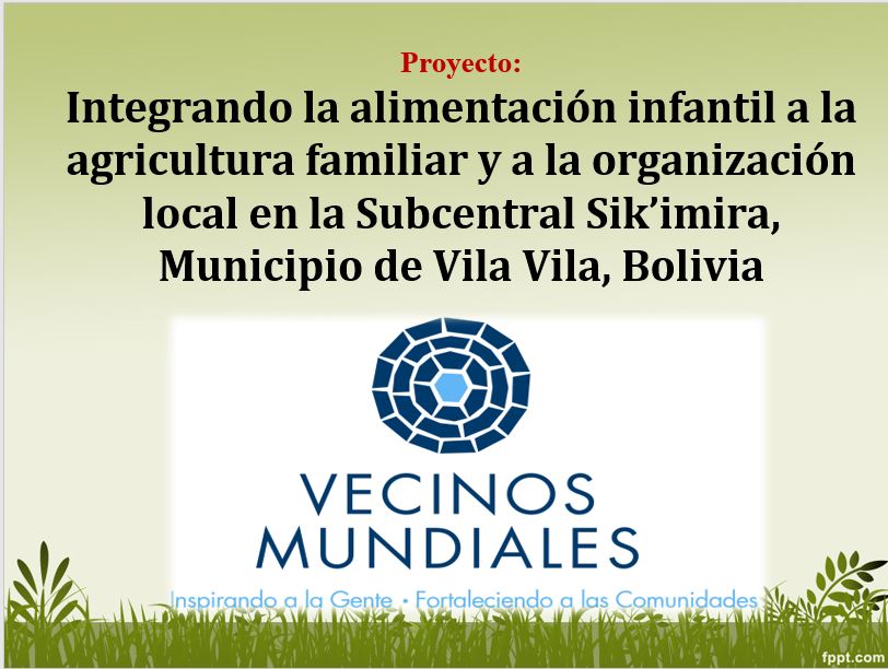 El proyecto que implementa Vecinos Mundiales en las seis comunidades de la Subcentral de Sik’imira, intenta vincular el componente de alimentación, al de agricultura y a la  organización local y cómo este último puede influir positivamente las prácticas alimentarias de las familias y especialmente, de los niños menores de  5 años. El levantamiento inicial de información consta de: DRP, encuestas y entrevistas en profundidad. El DRP se realizó en las seis comunidades, a través de talleres participativos con varones y mujeres, y tuvo una duración aproximada de 6 horas. Los resultados más relevantes del DRP incluyen que hace 17 años las familias vivían en las montañas, alimentándose principalmente de  trigo, quinua, tarwi, papa y  maíz. Con la apertura del camino muchas familias se trasladaron las zonas bajas, debido a que el camino les ofrecía mayores posibilidades de comerciar sus productos agrícolas; esto implicó que el cultivo y el consumo de productos de altura se hayan reducido. En su lugar se fue introduciendo frutales como la papaya, guayaba, naranja y limón, entre otros; sin embargo,  la presencia de plagas y enfermedades y la necesidad de producir mayor cantidad de frutas y comercializarlas está dando lugar al uso de pesticidas químicos de manera reciente. En cuanto a las organizaciones locales, tenemos a la Directiva de la Subcentral que coadyuva las demandas y necesidades de las seis comunidades. Existen otras organizaciones como  de las mujeres, la Asociación de agricultores de Sotasi y las guarderías rurales. (Wawa wasis).
