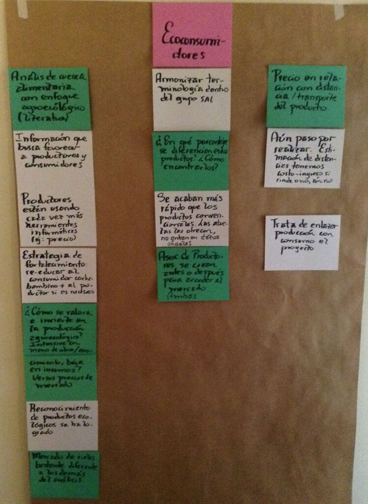 • Mapa de circulación de alimentos ecológicos frescos: Este mapa junto con las imágenes en movimiento que se presentarán (GIF) mostrarán tanto los resultados de la revisión de bases de datos nacionales (encuesta de hogares, Censo Agropecuario, etc.) y el análisis de resultados de 100 entrevistas a instituciones y personas claves que trabajan con producción ecológica en Cochabamba.